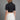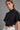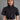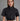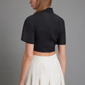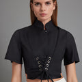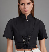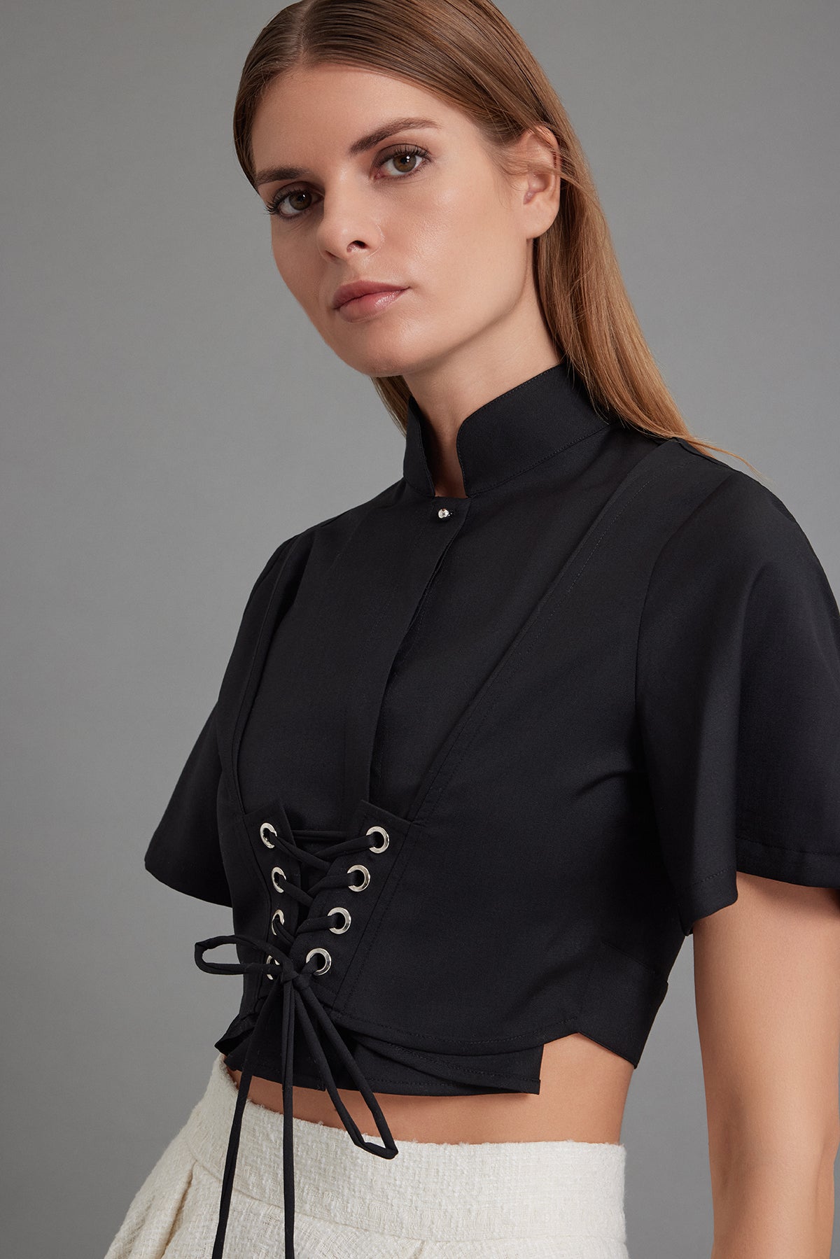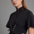 This black 100% wool blouse, featuring silver eyelet details, folds inward from the side panels of the cups and ties at the front. With elbow-length sleeves and a partially open stand-up collar, it offers a distinctive design.