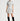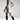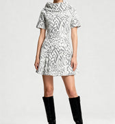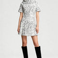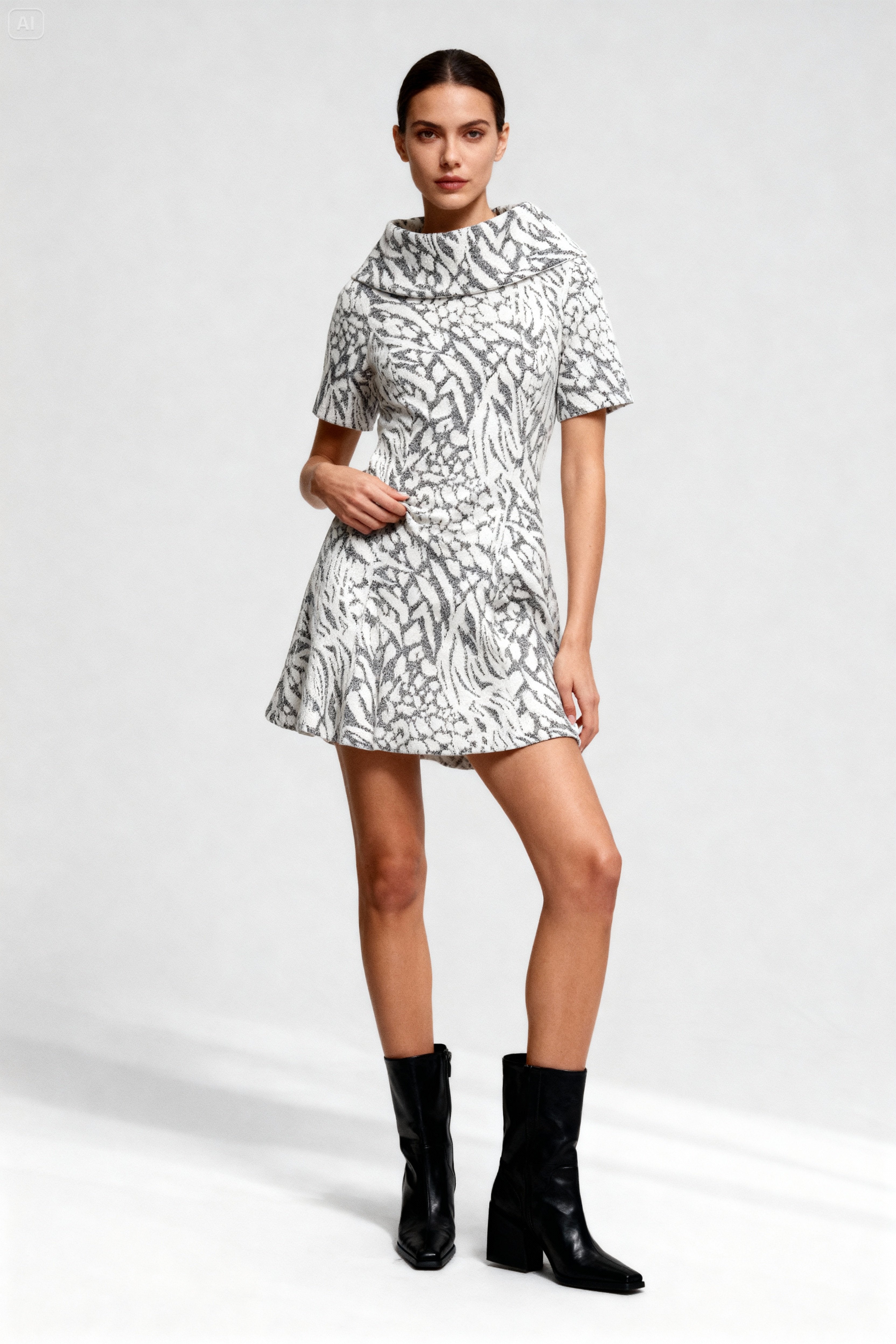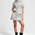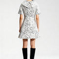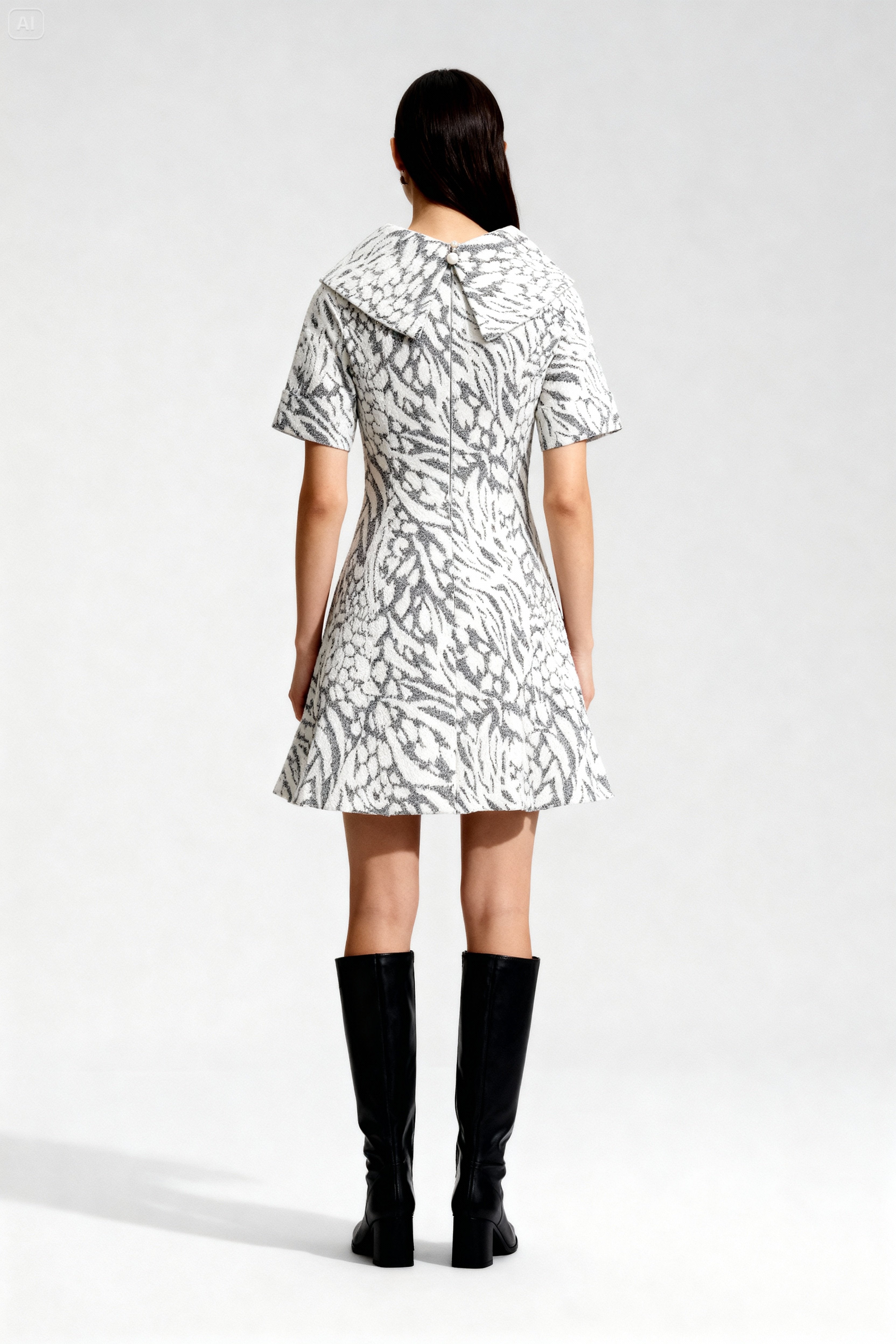 This short-sleeved A-line dress in grey and off-white features a large, high neckline that cascades down the back like a bird's wings, splitting into two pieces. The chic back design of this outfit makes it unique and takes your entire look to the next level.