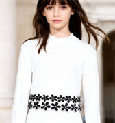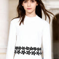 Uzun kollu crop örme üstün etek ucu ile kollarının ucu kabartmalı çiçek aplikeler ile süslenmiştir. Örme kumaş yeterince yumuşak ve esnek olduğu için kazağın gizli fermuar veya kesik gibi bir kapama yoktur. Bu kazak-etek bir çift ayakkabıyla eşleştirmek için 2024/25 Sonbahar-Kış Augie L'eauphant ayakkabı koleksiyonunu keşfedin.